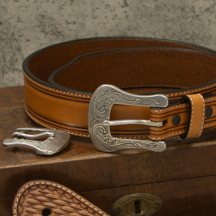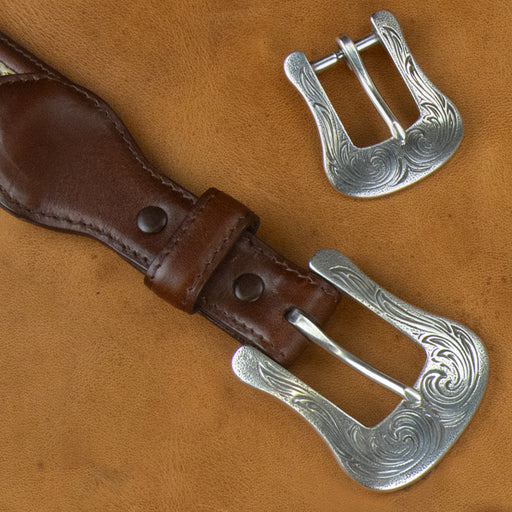 Red River Buckles, adorned with intricate engraving details, are offered in two sizes and a stunning antique silver finish.