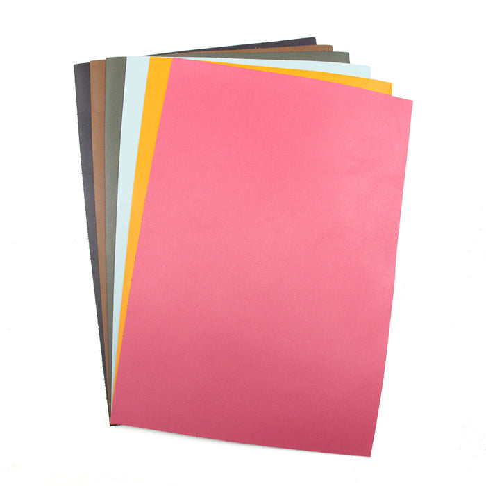 Get creative with assorted colors! These finished A5, A4 and B4 panels are cut from our Siena Full Grain Leather. Each pack includes 6 assorted color leather panels, they are perfect size for small leather goods, accessories or as accent for larger projects.
