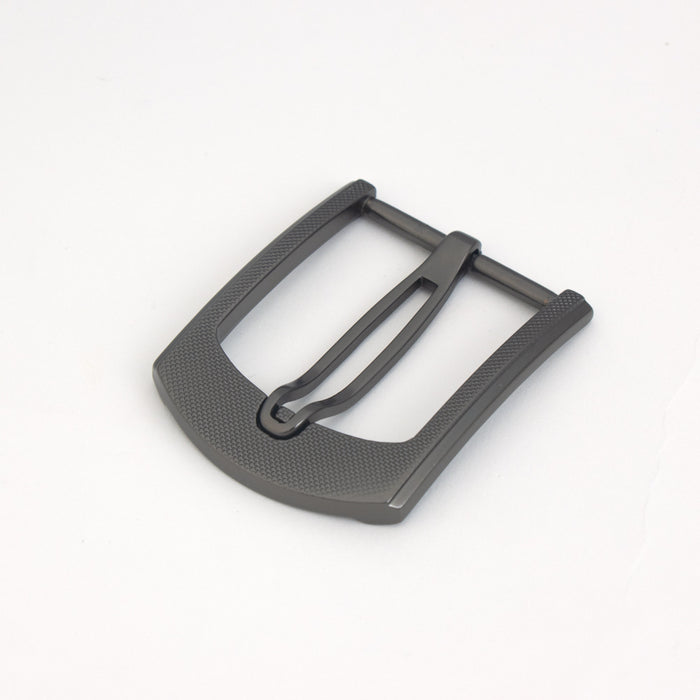 The Aero dress buckle in a sleek gunmetal finish features a wide prong, offering a unique and modern look.