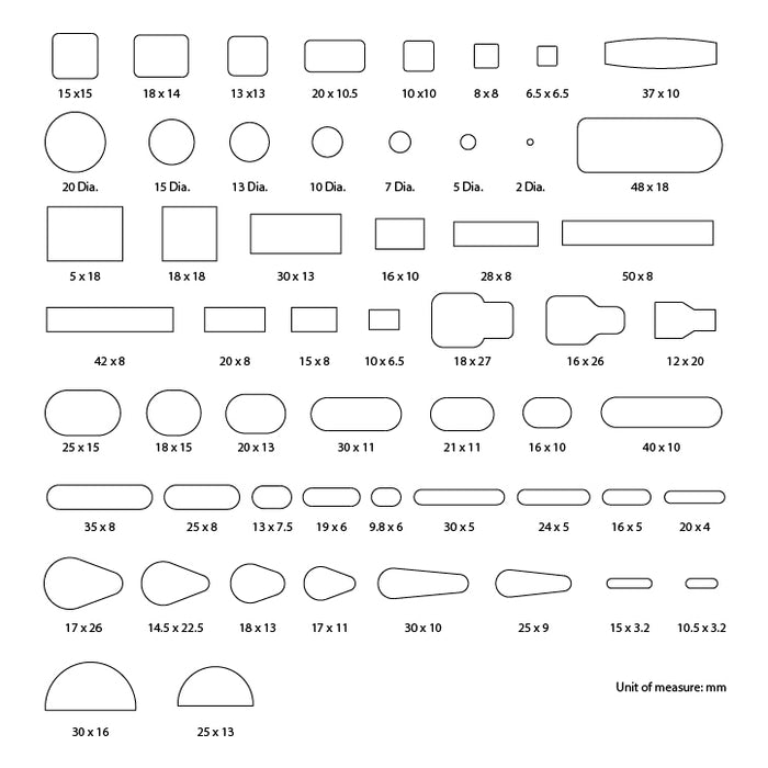 This set of Economy Punch Dies is a cost-effective way to cut shapes in various size and style options. Most punches can become quite expensive when you try to own each size, and that's where this die comes into play. This set includes 55 dies. You can punch in a few different ways. One way is to use a flat piece of wood that slightly covers the die and then strike it with a soft mallet or maul. Alternatively, you can use the Craftplus® Multi-Purpose Leather Hand Press with a press plate to cut easily with even force. We recommend using a punch board underneath to protect the dies.