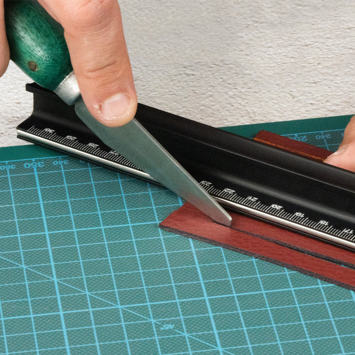 Basic skiving knife for cutting lightweight leather. Wood handle.