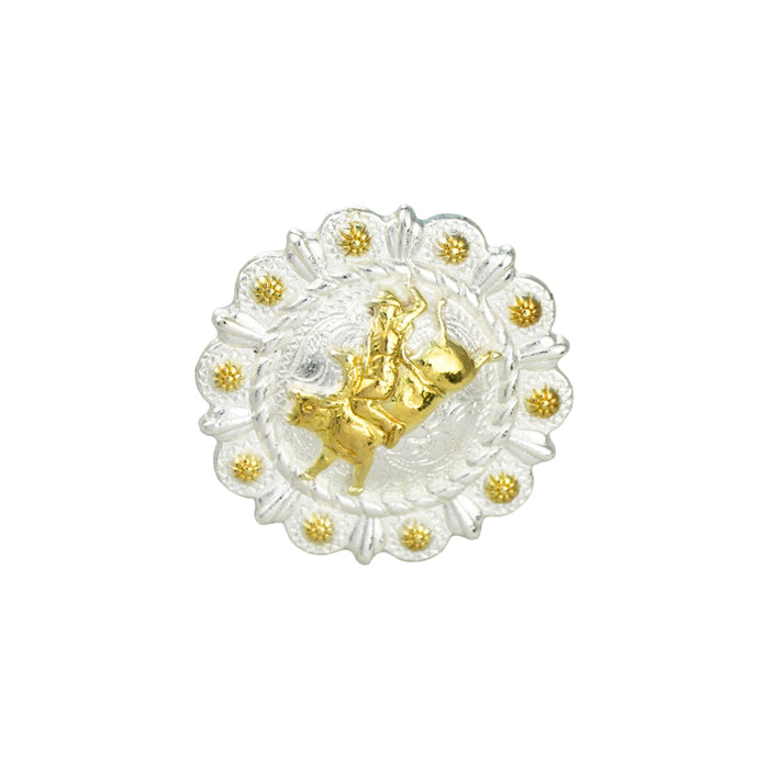 Two tone berry conchos with three-dimensional themed center ornament with engraved background and rivet border detail.