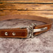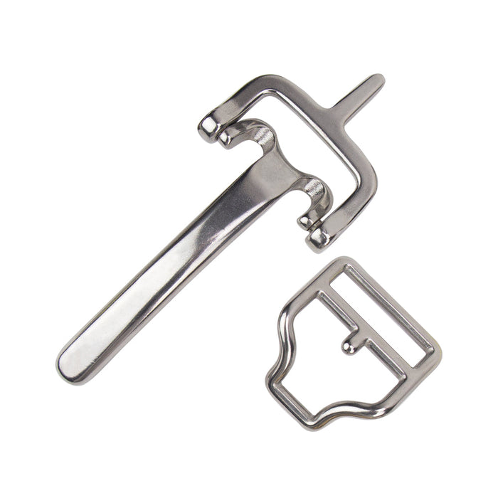 Sophisticated stainless steel two-part collar fastener with a distinctive center rod. What makes this clasp unique is its lever-action buckling mechanism, which gives it a snug fit.
