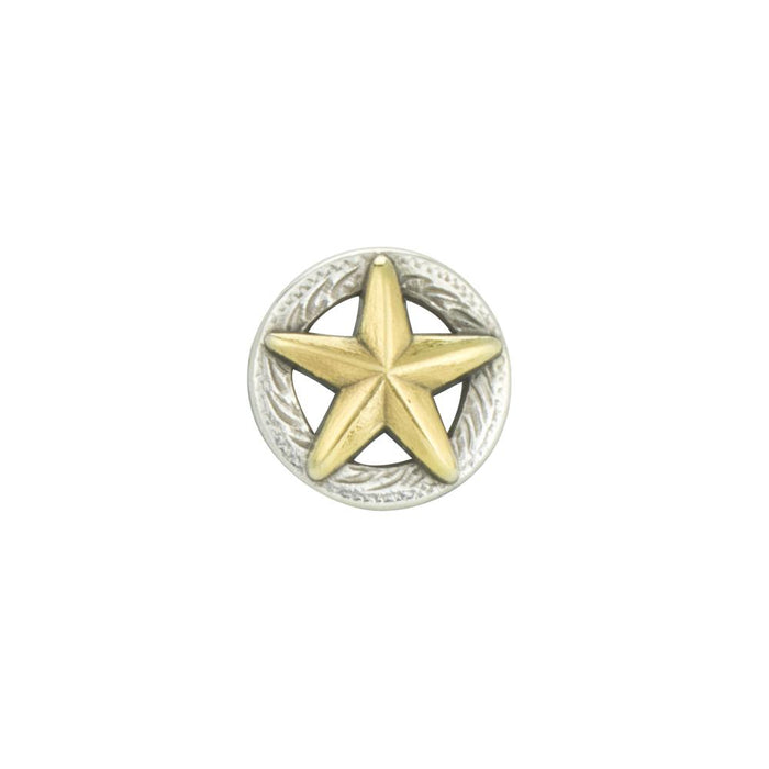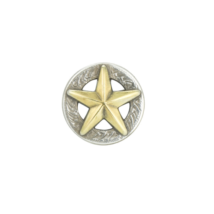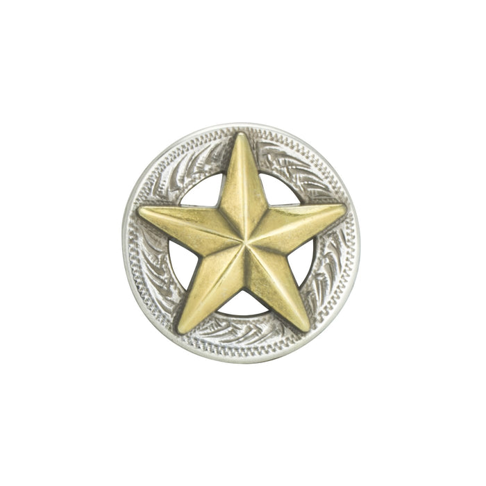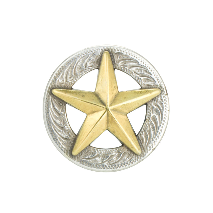 Two tone star conchos with smooth, three-dimensional center star and engraved border detail.